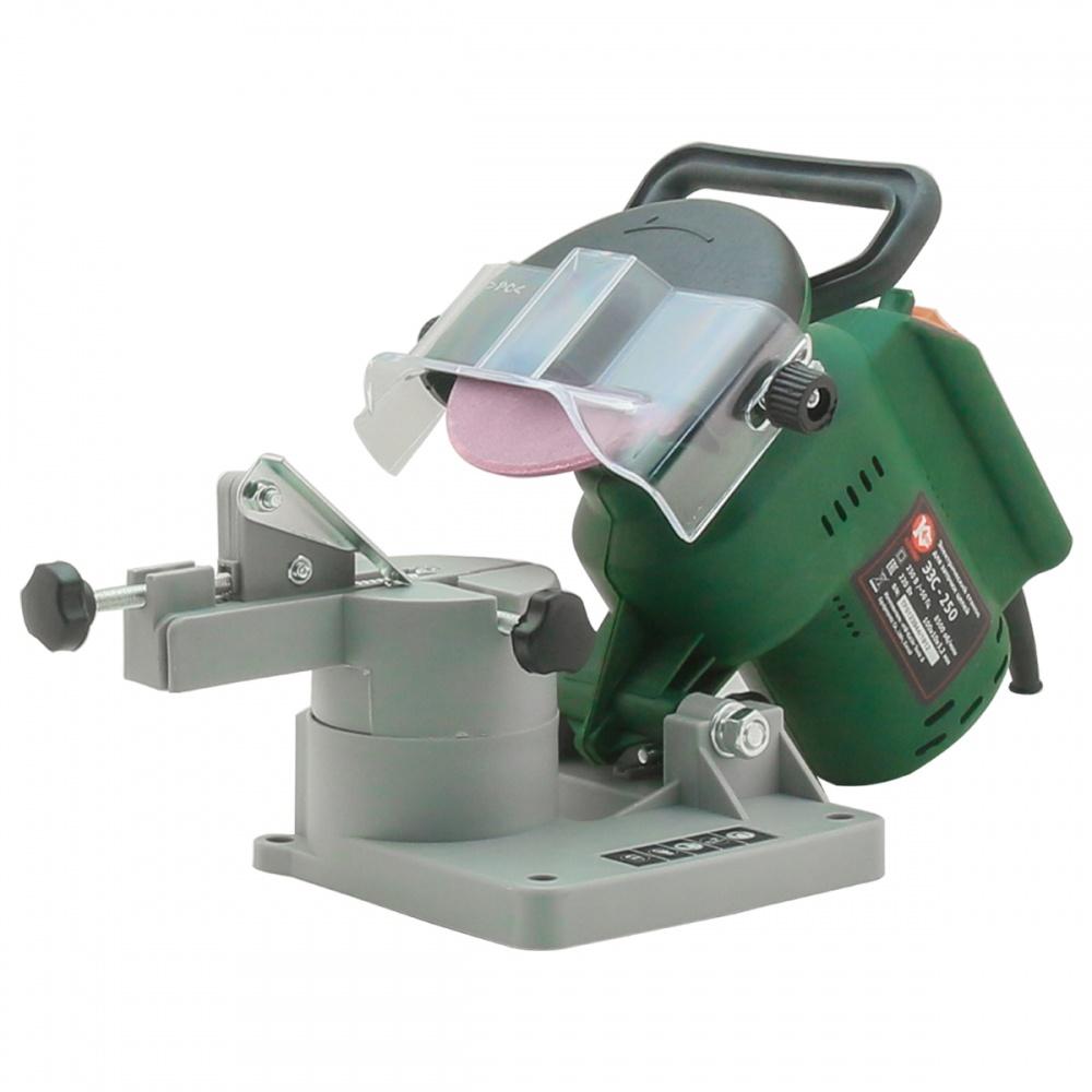 Электрический станок для заточки цепей Калибр ЭЗС-250 предназначен для заточки цепей для цепных электрических и бензиновых пил. В основании имеются монтажные отверстия для крепления станка на рабочем столе (верстаке). На корпус двигателя крепится рукоятка, для удобства управления абразивным кругом. Установленный в станке коллекторный двигатель с двойной изоляцией , обеспечивает максимальную электробезопасность при работе и не требует заземления. Для защиты оператора станок оснащён защитными устройствами: кожухом, закрывающим более 60 % абразивного круга и подвижным пластиковым экраном.