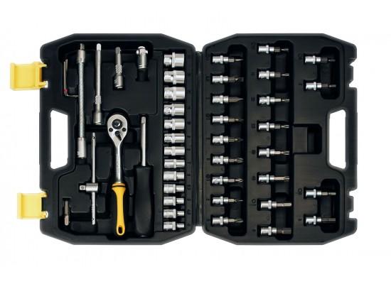 Набор торцевых головок 1/4, 45шт Энкор 20776 - ремонтно-монтажный комплект приспособлений для выполнения крепежных операций с болтами и гайками шестигранного профиля, а также винтами, имеющими плоский, крестовой и звездообразный шлицы. В наборе предусмотрено множество вспомогательных инструментов для удобства работы в труднодоступных местах. |