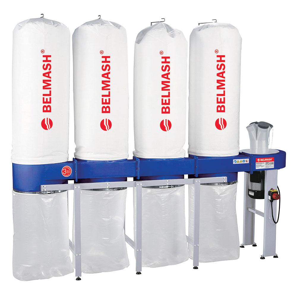 BELMASH DC4500-F4/400 состоит из четырех одинаковых секций. Разделительные корпуса и улитка соединены между собой последовательно. К корпусам с помощью специальных зажимов крепятся четыре фильтра сверху и четыре стружкосборника снизу. Вся конструкция закреплена на основании с помощью кронштейнов и стоек.