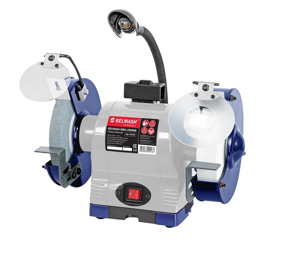 Конструкция. По центру расположен мощный асинхронный двигатель (600 Вт). По обе стороны от двигателя установлены заточные диски диаметром 200 мм и шириной 25 и 40 мм с различной зернистостью. Диски изготовлены из электрокорунда (нормальный 15А и белый 25А). Такой абразив используют для восстановления эксплуатационных свойств ручного инструмента, такого как ножи, топоры, стамески и т. п.; для снятия заусенцев, фасок, обдирки на небольших заготовках. Оба диска оснащены рабочими упорами (подручниками), защитными кожухами (листовая сталь), искрозащитными экранами (один из них с линзой).